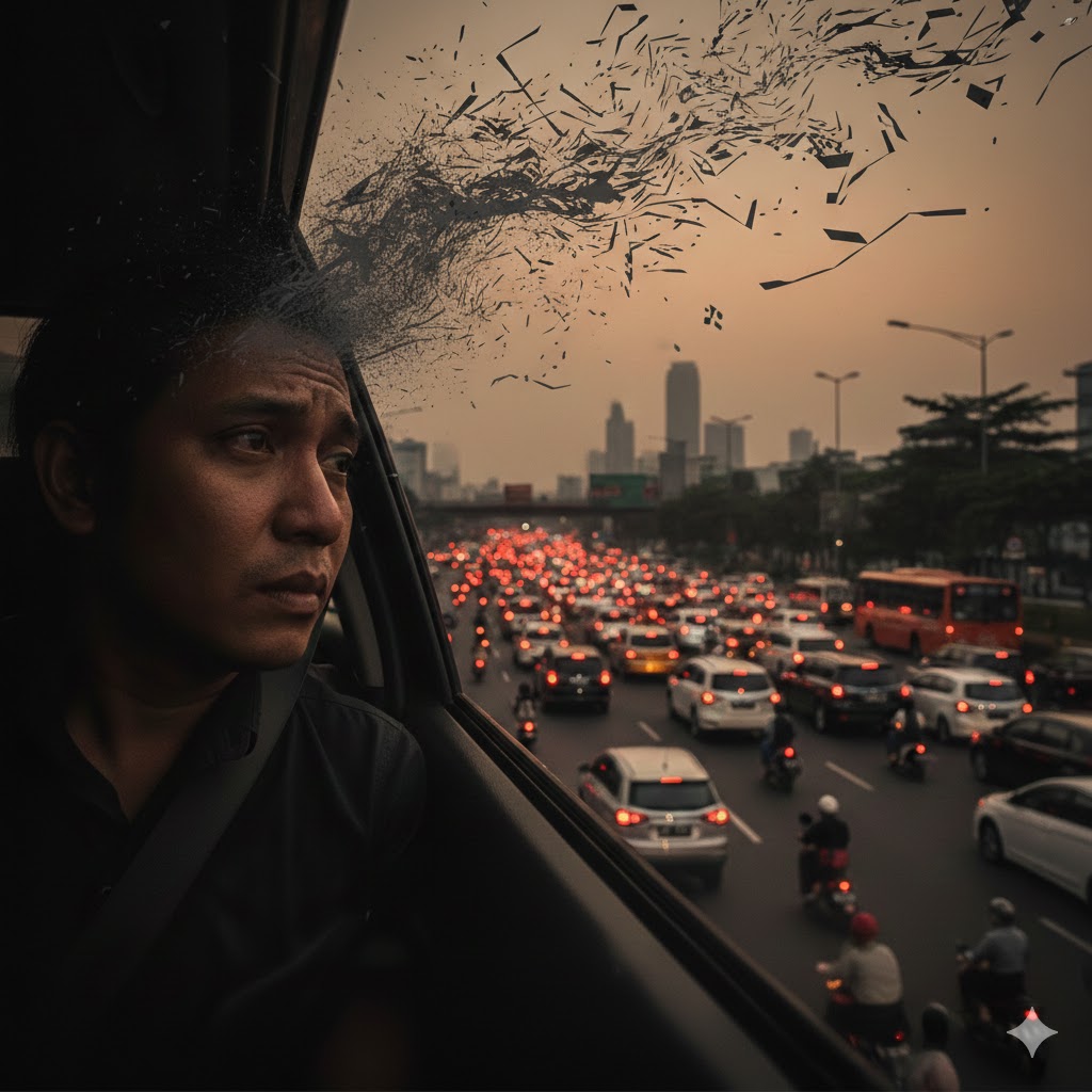 Di luar kerusakan fisik, kemacetan Jakarta menyerang fondasi kesejahteraan mental para penduduknya. Pengalaman harian terjebak dalam macet menciptakan beban psikologis yang signifikan, yang sering kali bermanifestasi dalam bentuk stres kronis, kecemasan, dan gangguan suasana hati. Penelitian terhadap pegawai di sektor transportasi di Jabodetabek menunjukkan bahwa lebih dari 51% responden mengalami gangguan kesehatan mental kategori berat akibat paparan kemacetan yang berkepanjangan.